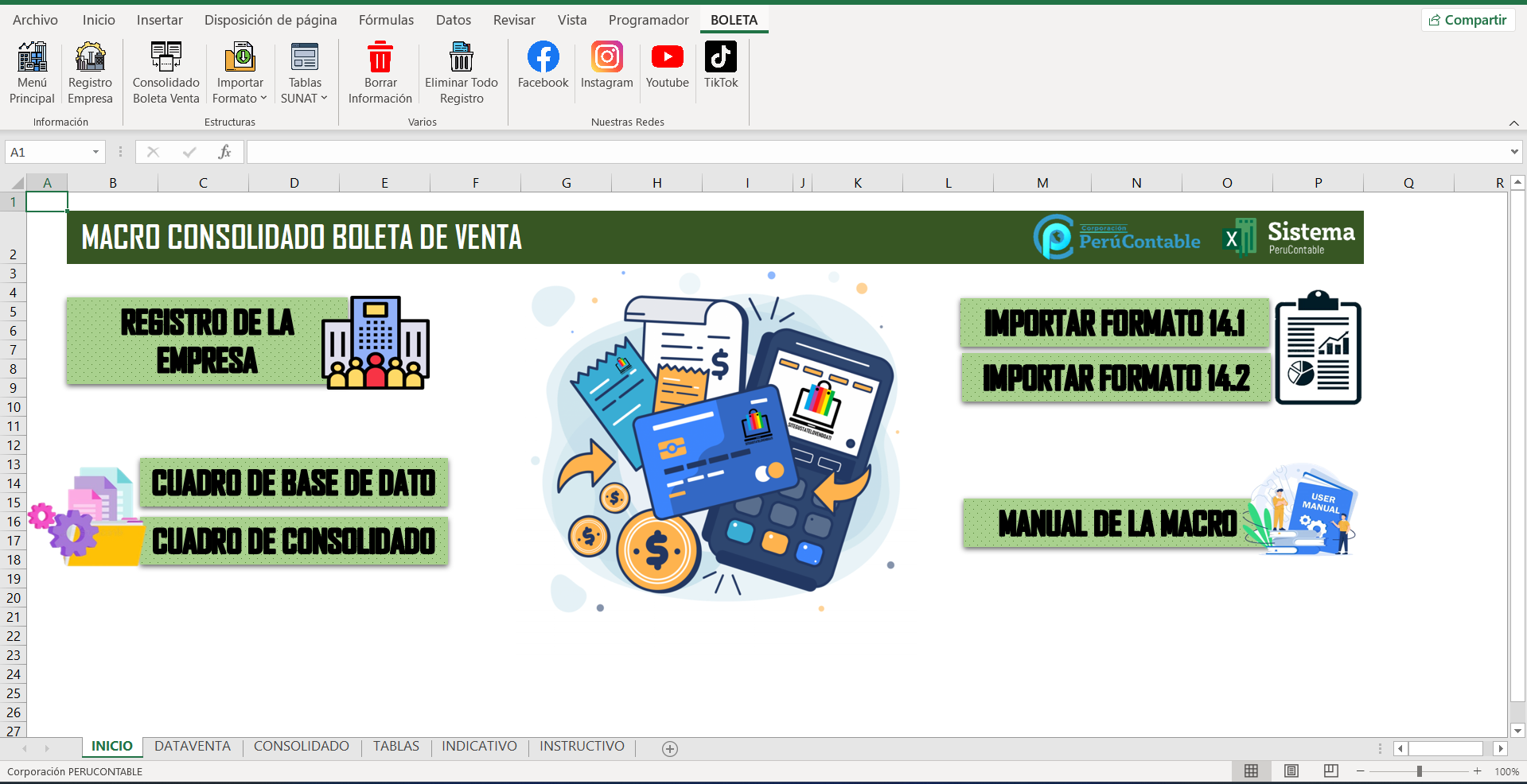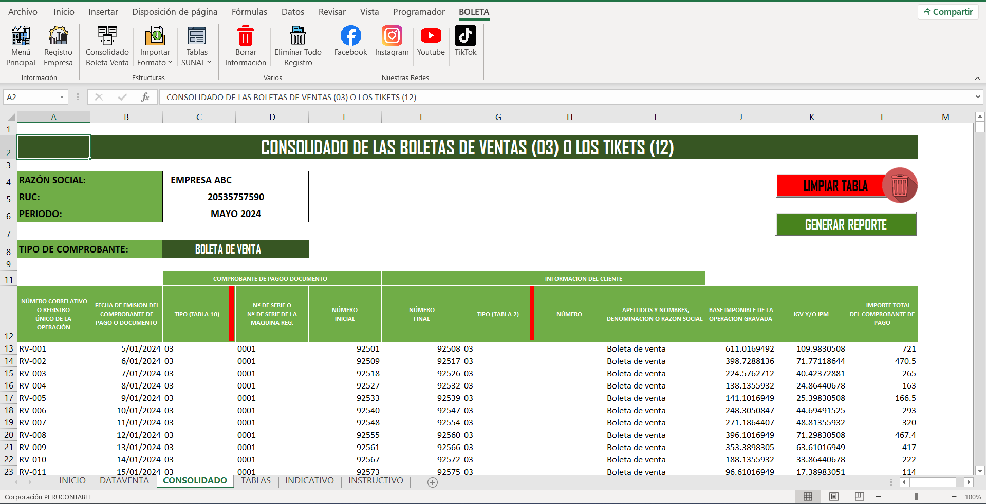 La macro Consolidado de Boletas de Venta está diseñada para centralizar y gestionar automáticamente las boletas de venta con importes menores a S/ 700.00. Esta herramienta no solo facilita la consolidación de la información, sino que también optimiza el registro de tus operaciones, garantizando un control más eficiente y organizado. Además, permite reducir errores en la administración de datos y asegura que tus registros cumplan con los requisitos establecidos.