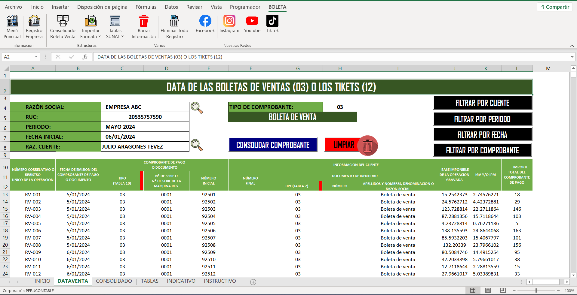 Macro para Consolidado de Boleta de Venta: Esta herramienta está diseñada para consolidar y organizar de manera eficiente las boletas de venta con importes menores a S/ 700.00. Permite recopilar y gestionar la información de forma masiva, asegurando un registro claro y ordenado. Además, optimiza el proceso de control de ventas, reduciendo riesgos de errores que puedan ocasionar inconsistencias en los registros o problemas administrativos.